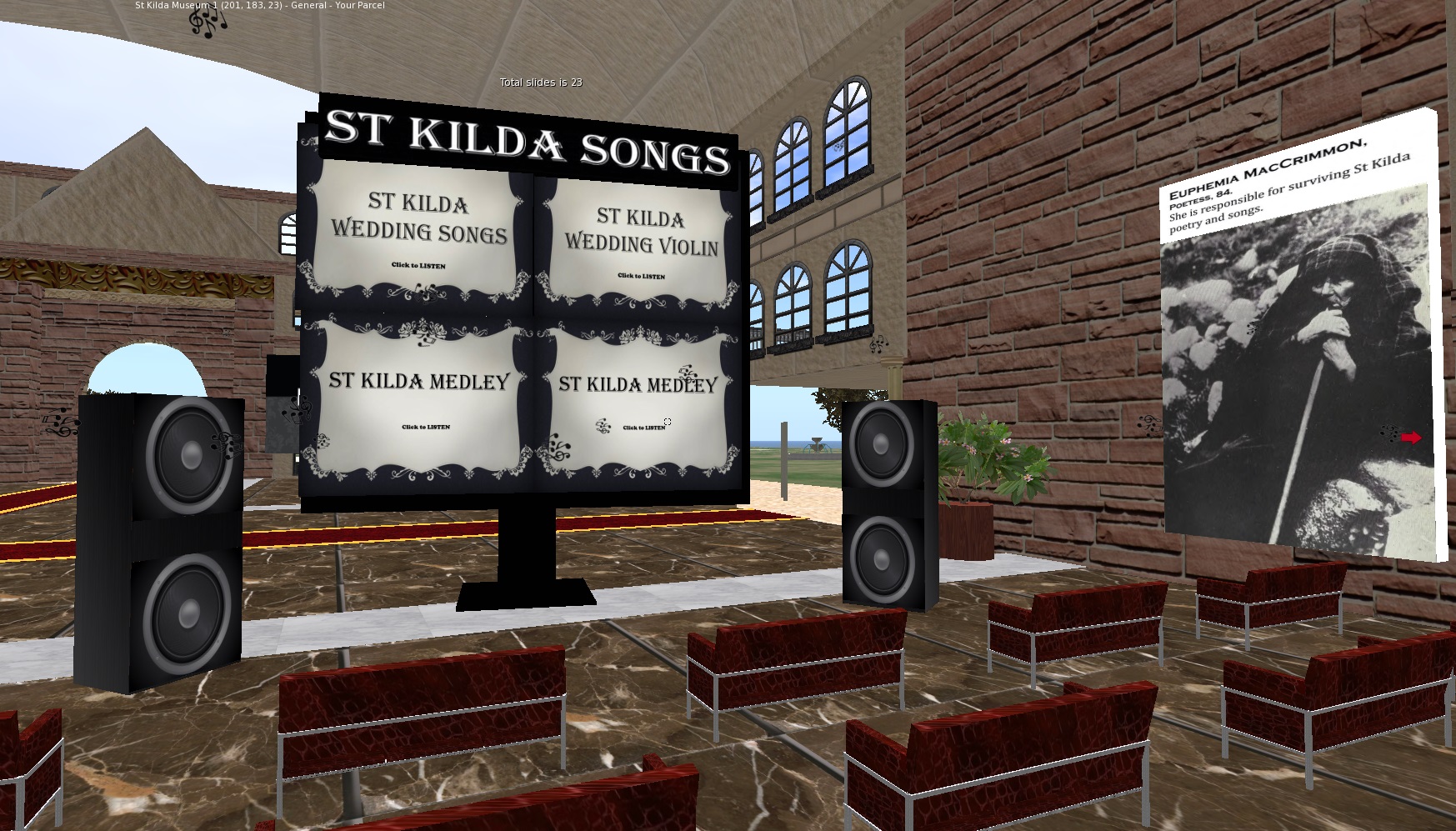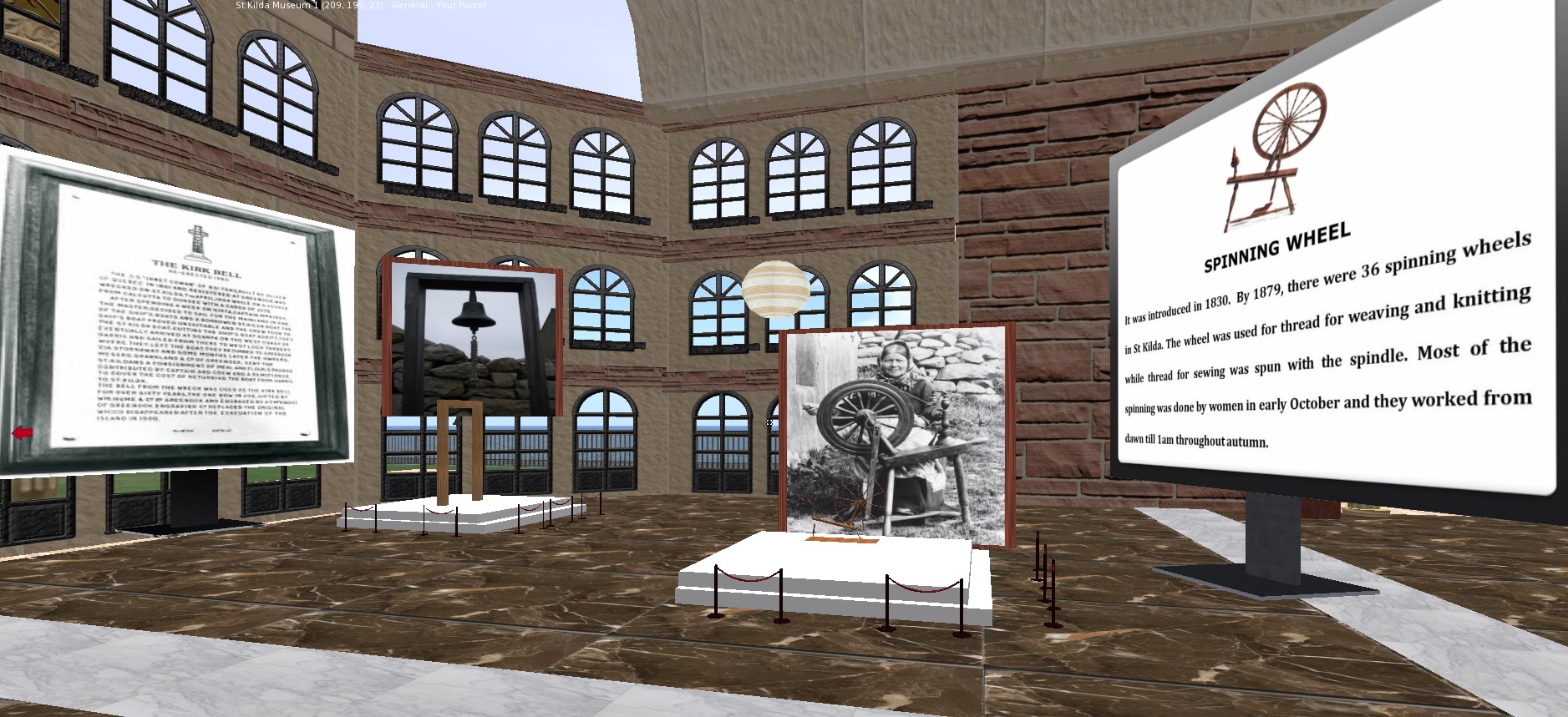 The St Kilda virtual museum has been created as a source of St Kilda history. The building is split in two floor with various sections which contains information on history of St Kilda; animals, fowling and birds on St Kilda. The top floor houses information and models of houses in St Kilda. The virtual museum offers archaeologists and visitors the chance to discover a variety of information about Hirta; information is available in visual, text and audio forms. Visitors have the chance to visit the reconstructed island from the museum through teleport portals. Knowledge gained from the visit can be tested by attempting the quiz in various sections in the museum. Also, at the entrance is a tour guide who gives all visitors a guide to the museum.